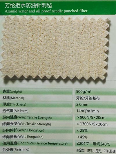 該滌綸氈是在普通滌綸氈生產(chǎn)基礎(chǔ)上進(jìn)行特殊的拒水防油,使濾料具有良好的防水拒油性能,從而用在含濕、含油較大的煙氣處理中,抗揭露性能好,不宜糊袋,可以有效的提高濾袋的使用壽命。